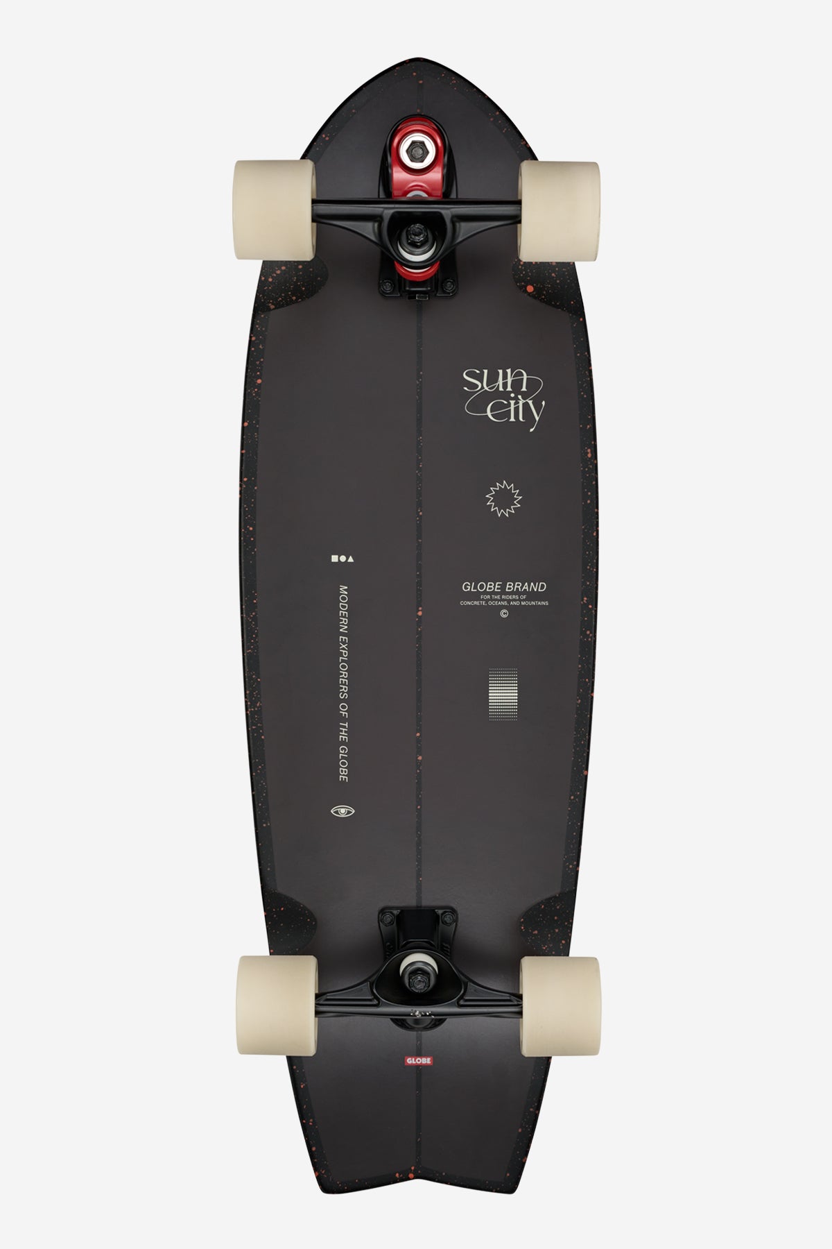 Short-length swallow-tail cruiser with Slant surf/skate trucks for a surf-like carving experience.